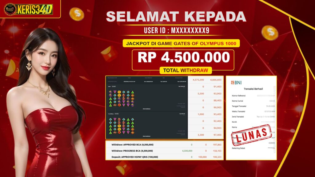 Setiap hari, member KERIS34D berhasil meraih jackpot besar dari berbagai provider slot ternama yang kami sediakan, seperti Pragmatic Play, Habanero, PG Soft, dan masih banyak lagi. Kami secara rutin menampilkan bukti screenshot atau rekapan kemenangan yang berhasil diraih, mulai dari kemenangan ratusan ribu hingga puluhan juta rupiah. Semua slip kemenangan ini kami hadirkan untuk membuktikan bahwa di KERIS34D, peluang menang itu nyata