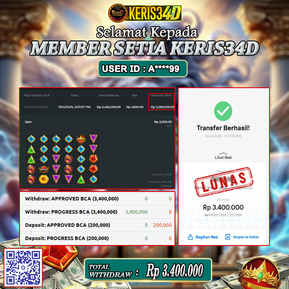 Setiap hari, member KERIS34D berhasil meraih jackpot besar dari berbagai provider slot ternama yang kami sediakan, seperti Pragmatic Play, Habanero, PG Soft, dan masih banyak lagi. Kami secara rutin menampilkan bukti screenshot atau rekapan kemenangan yang berhasil diraih, mulai dari kemenangan ratusan ribu hingga puluhan juta rupiah. Semua slip kemenangan ini kami hadirkan untuk membuktikan bahwa di KERIS34D, peluang menang itu nyata