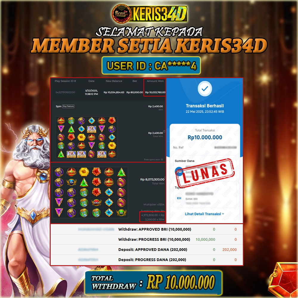 KERIS34D dikenal sebagai situs terpercaya yang selalu menghadirkan pengalaman bermain slot online yang aman, fair, dan berlisensi resmi. Di sini, kami tidak hanya sekadar memberikan janji, tapi bukti nyata berupa slip kemenangan yang dapat Anda lihat secara langsung.