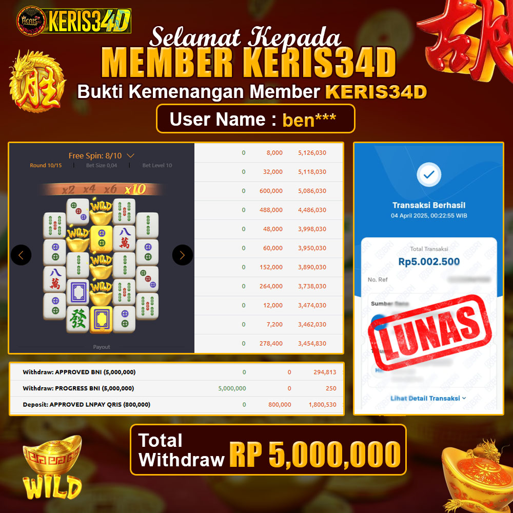 Setiap hari, member KERIS34D berhasil meraih jackpot besar dari berbagai provider slot ternama yang kami sediakan, seperti Pragmatic Play, Habanero, PG Soft, dan masih banyak lagi. Kami secara rutin menampilkan bukti screenshot atau rekapan kemenangan yang berhasil diraih, mulai dari kemenangan ratusan ribu hingga puluhan juta rupiah. Semua slip kemenangan ini kami hadirk