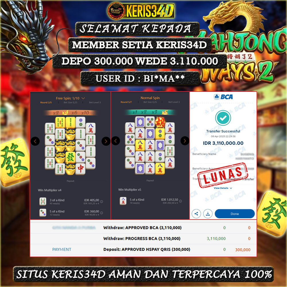 Setiap hari, member KERIS34D berhasil meraih jackpot besar dari berbagai provider slot ternama yang kami sediakan, seperti Pragmatic Play, Habanero, PG Soft, dan masih banyak lagi. Kami secara rutin menampilkan bukti screenshot atau rekapan kemenangan yang berhasil diraih, mulai dari kemenangan ratusan ribu hingga puluhan juta rupiah. Semua slip kemenangan ini kami hadirkan untuk membuktikan bahwa di KERIS34D, peluang menang itu nyata