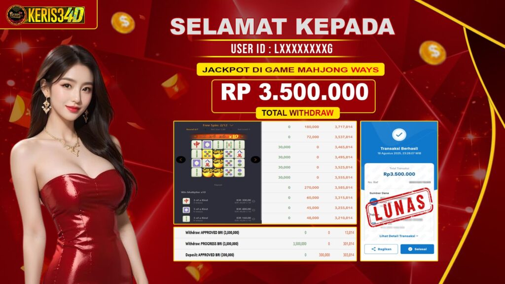 Setiap hari, member KERIS34D berhasil meraih jackpot besar dari berbagai provider slot ternama yang kami sediakan, seperti Pragmatic Play, Habanero, PG Soft, dan masih banyak lagi. Kami secara rutin menampilkan bukti screenshot atau rekapan kemenangan yang berhasil diraih, mulai dari kemenangan ratusan ribu hingga puluhan juta rupiah. Semua slip kemenangan ini kami hadirkan untuk membuktikan bahwa di KERIS34D, peluang menang itu nyata