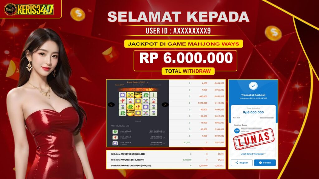 Setiap hari, member KERIS34D berhasil meraih jackpot besar dari berbagai provider slot ternama yang kami sediakan, seperti Pragmatic Play, Habanero, PG Soft, dan masih banyak lagi. Kami secara rutin menampilkan bukti screenshot atau rekapan kemenangan yang berhasil diraih, mulai dari kemenangan ratusan ribu hingga puluhan juta rupiah. Semua slip kemenangan ini kami hadirkan untuk membuktikan bahwa di KERIS34D, peluang menang itu nyata
