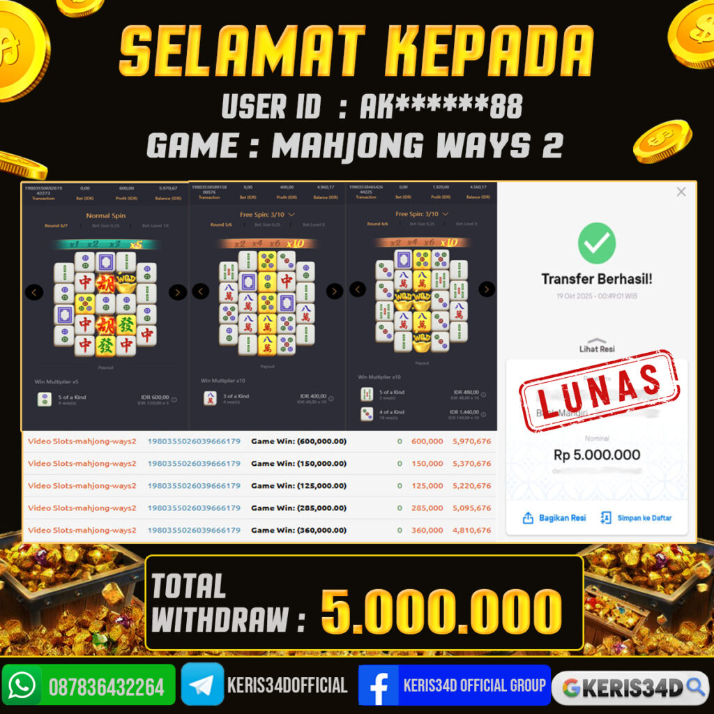 Setiap hari, member KERIS34D berhasil meraih jackpot besar dari berbagai provider slot ternama yang kami sediakan, seperti Pragmatic Play, Habanero, PG Soft, dan masih banyak lagi. Kami secara rutin menampilkan bukti screenshot atau rekapan kemenangan yang berhasil diraih, mulai dari kemenangan ratusan ribu hingga puluhan juta rupiah. Semua slip kemenangan ini kami hadirkan untuk membuktikan bahwa di KERIS34D, peluang menang itu nyata