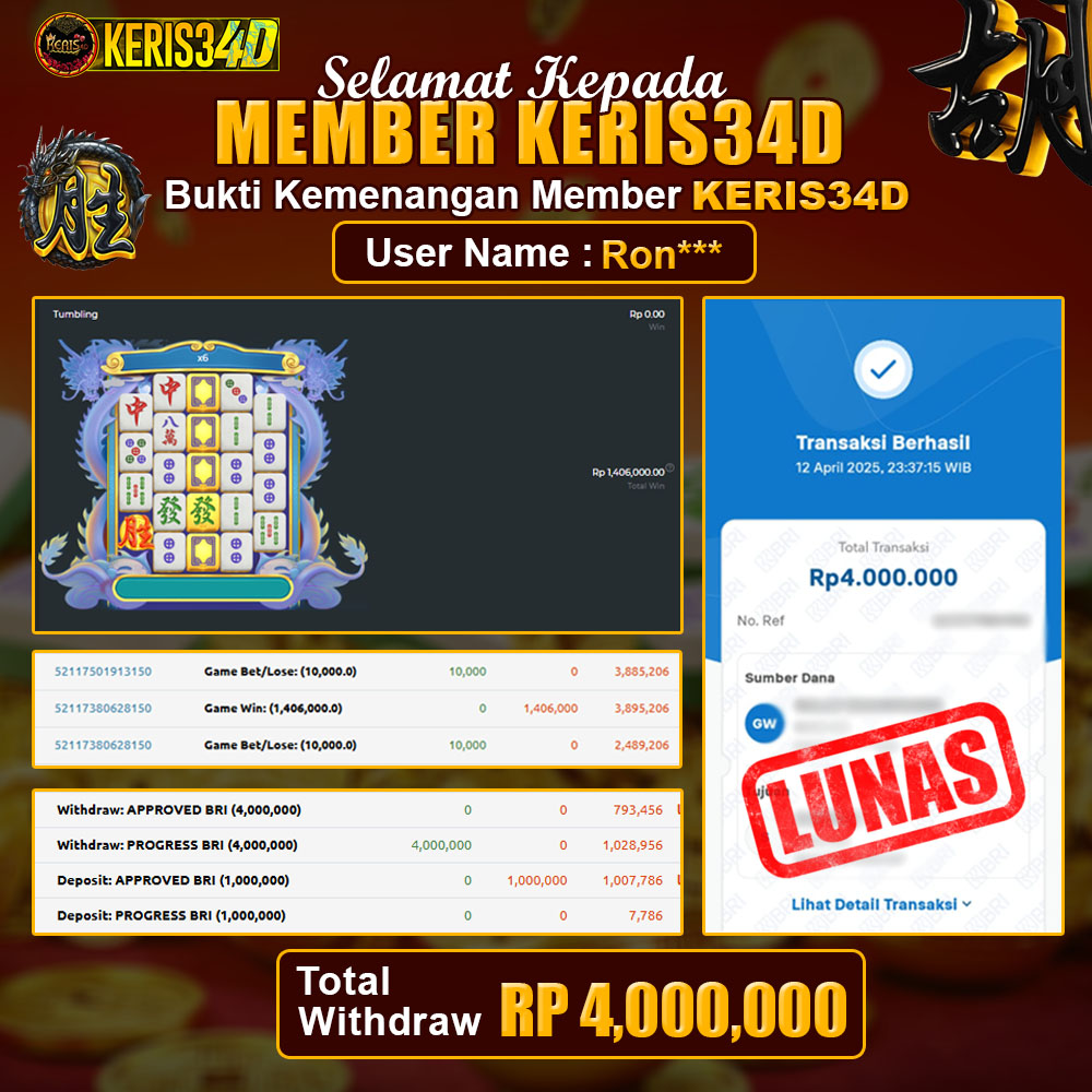 Setiap hari, member KERIS34D berhasil meraih jackpot besar dari berbagai provider slot ternama yang kami sediakan, seperti Pragmatic Play, Habanero, PG Soft, dan masih banyak lagi. Kami secara rutin menampilkan bukti screenshot atau rekapan kemenangan yang berhasil diraih, mulai dari kemenangan ratusan ribu hingga puluhan juta rupiah. Semua slip kemenangan ini kami hadirkan untuk membuktikan bahwa di KERIS34D, peluang menang itu nyata