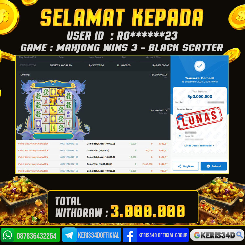 JACKPOT SLOT GACOR MAIN MAHJONG WINS 3 – BLACK 18 SEPTEMBER 2025, Jackpot Slot Gacor, Kemenangan Slot, Bukti Kemenangan Slot, Kemenangan PGSOFT, Menang Slot online, Slot Gacor, Situs Aman Terpercaya, WD Berapapun Pasti DI Bayar Tuntas, Maxwin Slot Online.