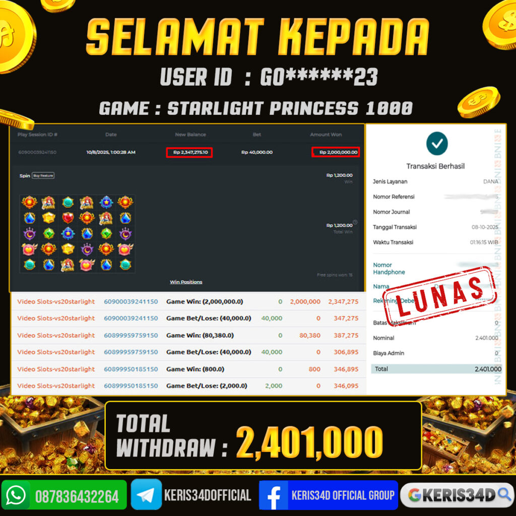 Setiap hari, member KERIS34D berhasil meraih jackpot besar dari berbagai provider slot ternama yang kami sediakan, seperti Pragmatic Play, Habanero, PG Soft, dan masih banyak lagi. Kami secara rutin menampilkan bukti screenshot atau rekapan kemenangan yang berhasil diraih, mulai dari kemenangan ratusan ribu hingga puluhan juta rupiah. Semua slip kemenangan ini kami hadirkan untuk membuktikan bahwa di KERIS34D, peluang menang itu nyata
