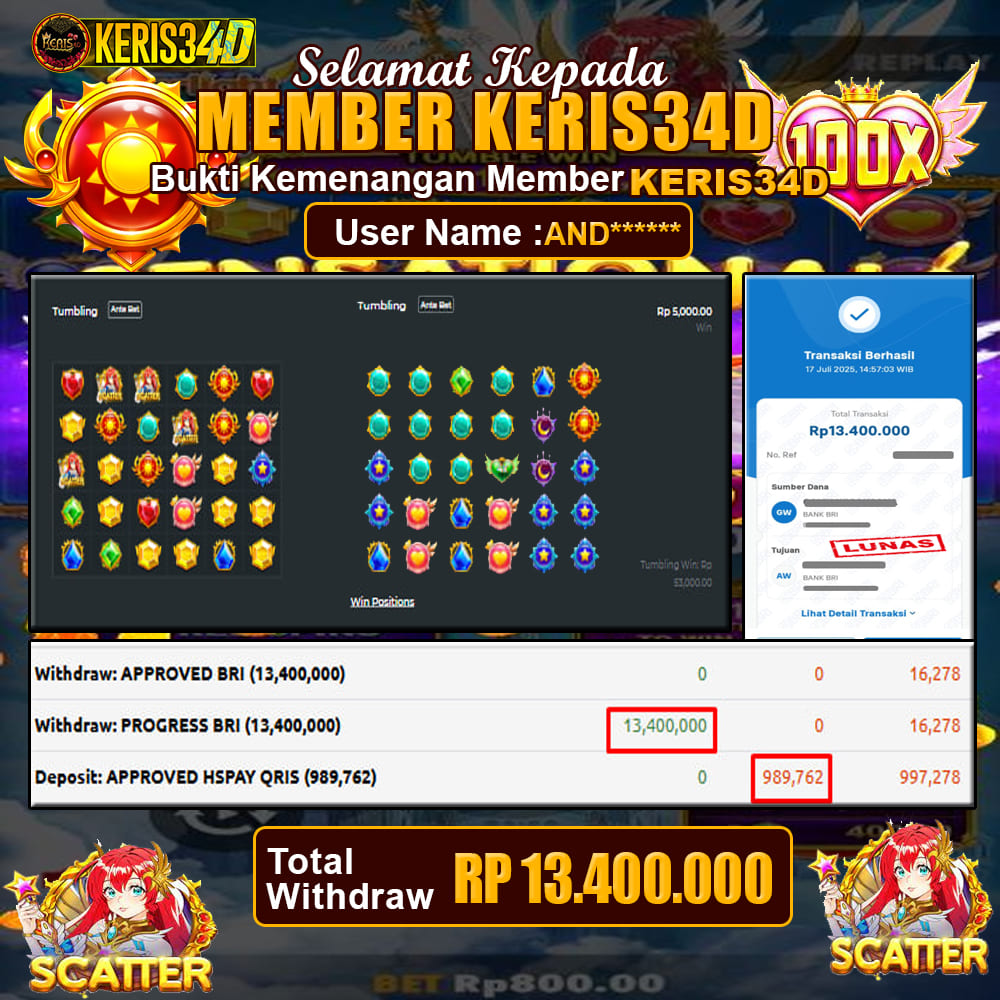 Setiap hari, member KERIS34D berhasil meraih jackpot besar dari berbagai provider slot ternama yang kami sediakan, seperti Pragmatic Play, Habanero, PG Soft, dan masih banyak lagi. Kami secara rutin menampilkan bukti screenshot atau rekapan kemenangan yang berhasil diraih, mulai dari kemenangan ratusan ribu hingga puluhan juta rupiah. Semua slip kemenangan ini kami hadirkan untuk membuktikan bahwa di KERIS34D, peluang menang itu nyata