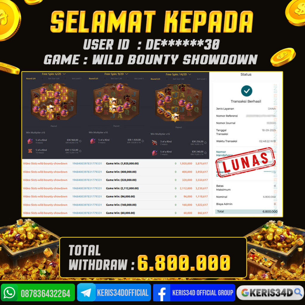 Setiap hari, member KERIS34D berhasil meraih jackpot besar dari berbagai provider slot ternama yang kami sediakan, seperti Pragmatic Play, Habanero, PG Soft, dan masih banyak lagi. Kami secara rutin menampilkan bukti screenshot atau rekapan kemenangan yang berhasil diraih, mulai dari kemenangan ratusan ribu hingga puluhan juta rupiah. Semua slip kemenangan ini kami hadirkan untuk membuktikan bahwa di KERIS34D, peluang menang itu nyata