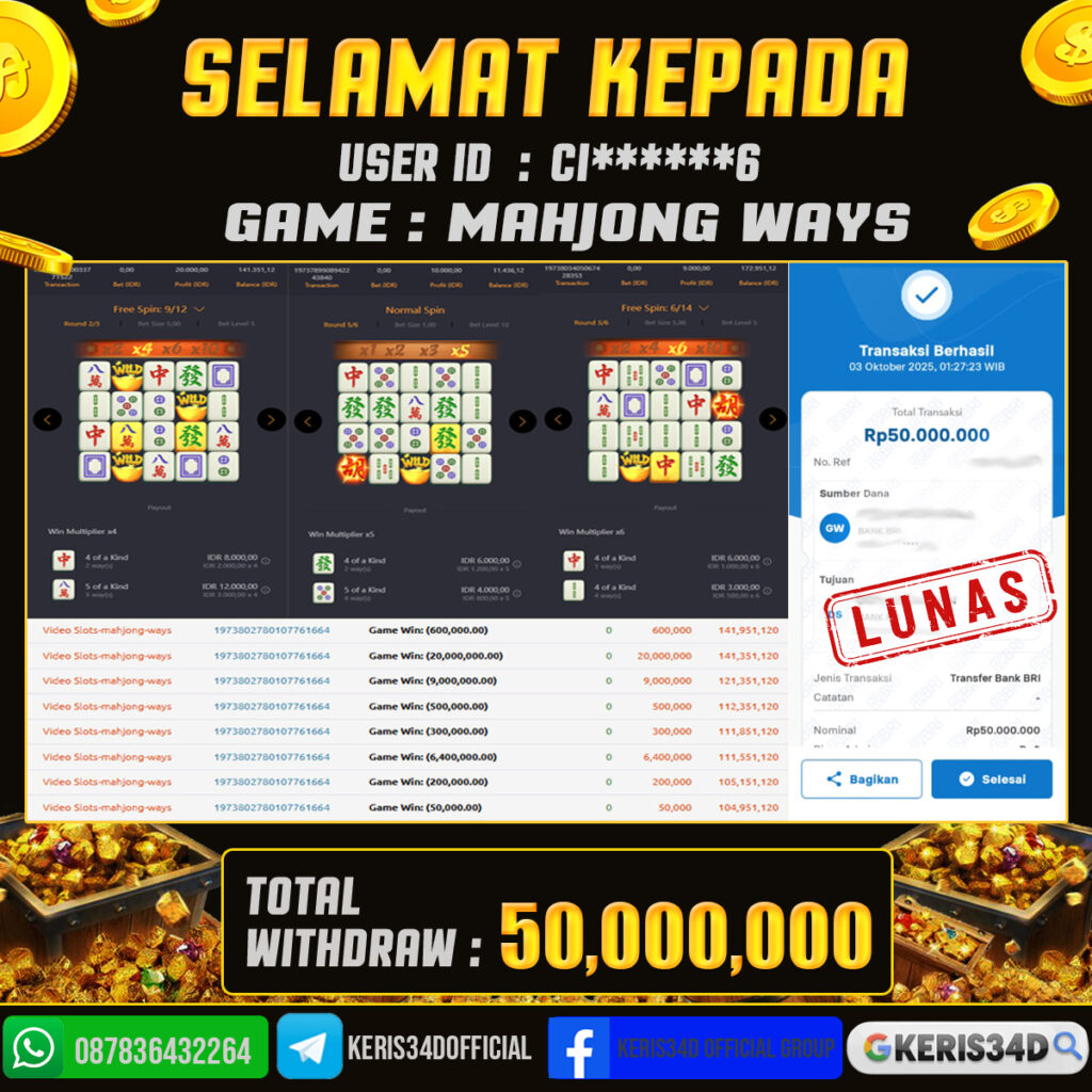 JACKPOT SLOT GACOR MAIN MAHJONG WAYS 03 OCTOBER 2025, Jackpot Slot Gacor, Kemenangan Slot, Bukti Kemenangan Slot, Kemenangan PGSOFT, Menang Slot online, Slot Gacor, Situs Aman Terpercaya, WD Berapapun Pasti DI Bayar Tuntas, Maxwin Slot Online.
