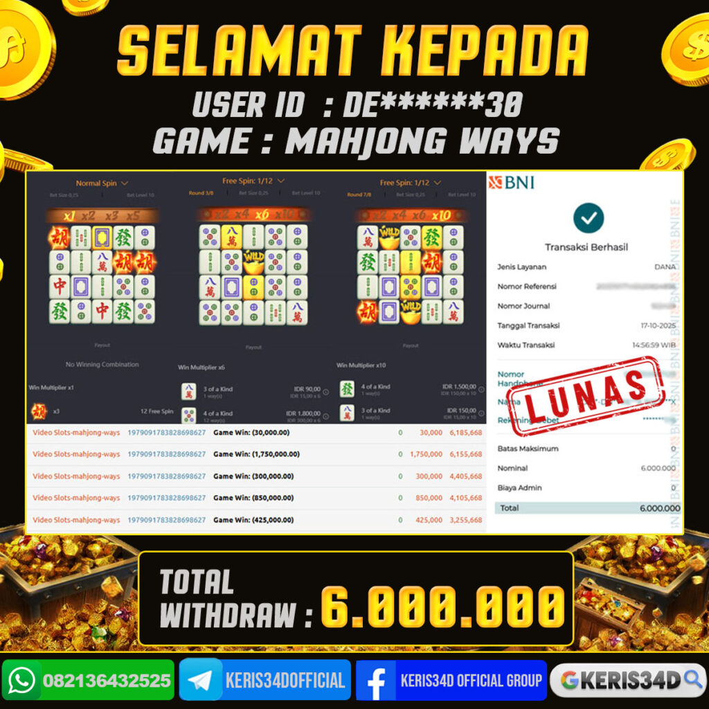 JACKPOT SLOT GACOR MAIN MAHJONG WAYS 17 OKTOBER 2025, Jackpot Slot Gacor, Kemenangan Slot, Bukti Kemenangan Slot, Kemenangan PGSOFT, Menang Slot online, Slot Gacor, Situs Aman Terpercaya, WD Berapapun Pasti DI Bayar Tuntas, Maxwin Slot Online.